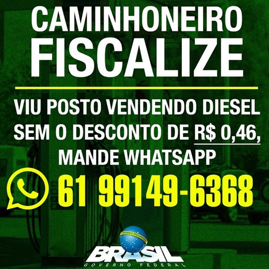 “Atenção, caminhoneiro! Este é seu canal para denúncia. De hoje até segunda-feira, de acordo com a renovação dos estoques, todas as bombas do país devem oferecer desconto de R$ 0,46 no litro do diesel. Ajude-nos a fiscalizar”, diz mensagem divulgada pelo Planalto.