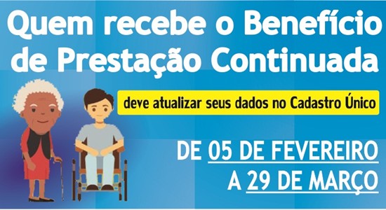 A Secretaria de Assistência Social informa que todos os idosos acima de 65 anos e pessoas com deficiência que recebem o benefício de prestação continuada (BPC), devem comparecer à sede da Secretaria no período de 05 de fevereiro a 29 de Março para realizar o cadastramento, evitando assim suspensão do seu benefício.