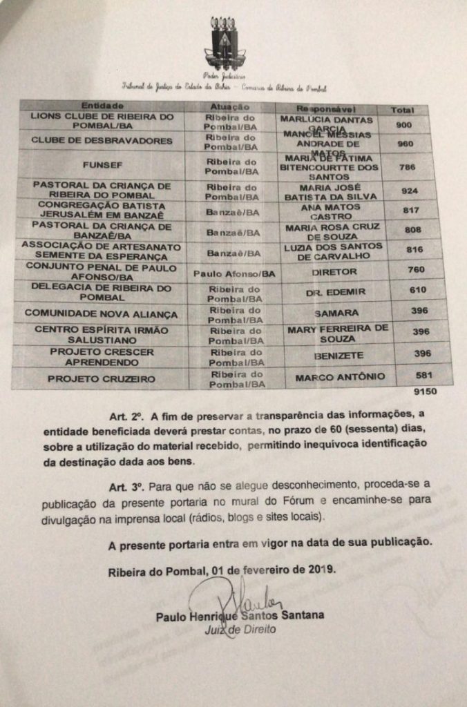 Foi divulgada na noite de segunda-feira, 06, a Portaria nº 001/2019, da Comarca de Ribeira do Pombal-BA, onde o juiz de Direito da Vara Crime, Execuções Penais, Júri, e Infância e Juventude, Dr. Paulo Henrique Santos Santana, decidiu doar 9.150 produtos falsificados, apreendidos, para treze entidades, órgãos, movimentos sociais, e agentes sociais.