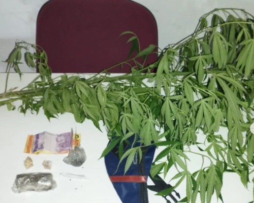 Com a dupla foram encontrados: 01 tablete contendo maconha, 02 trouxinhas contendo pedras de crack, pés da erva Cannabis Sativa (Maconha), e uma quantia de R$ 45,00 em espécie.