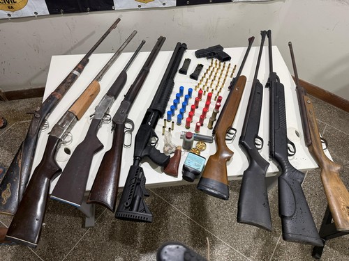 O rapaz ainda afirmou possuir outras armas, que estariam escondidas na residência de um amigo. No local, foram encontrados e apreendidos: 01 Rifle Winchester cal. 44, com numeração raspada; 01 espingarda cal. 22, com numeração raspada; 01 espingarda cal. 28, com numeração raspada; 01 espingarda de socar; 03 espingardas de pressão; insumos para recargas de munições (837 g de chumbo, 182 g de pólvora, 120 espoletas e buchas); 01 canivete; e 01 aparelho celular.