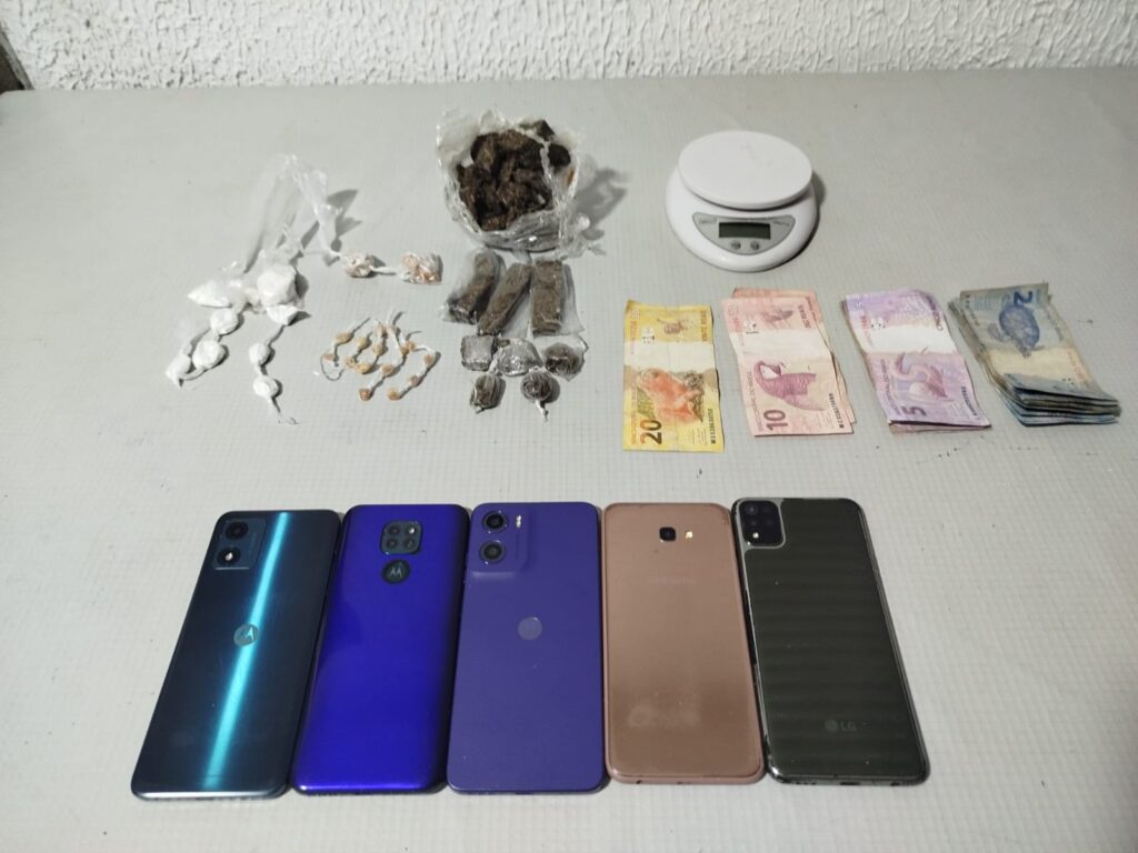 No momento da abordagem, os militares perceberam que próximo ao local da ação, dois homens correram para o interior de um bar (casa de prostituição), situado à mesma rua. Diante da suspeita, os policiais foram até o local, onde realizaram buscas no interior do estabelecimento, onde foram encontrados: 45 pedras de crack, 08 buchas pequenas de maconha, 01 bucha grande de maconha, 08 buchas de cocaína, 01 balança de precisão, e 05 aparelhos celulares.