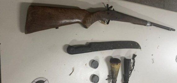 Os militares foram até o local indicado, onde encontraram a porta da residência danificada, bem como os envolvidos. O autor, um homem de 44 anos, cuja identidade não foi divulgada, foi flagrado portando uma espingarda de bucha, carregada, além de um facão.