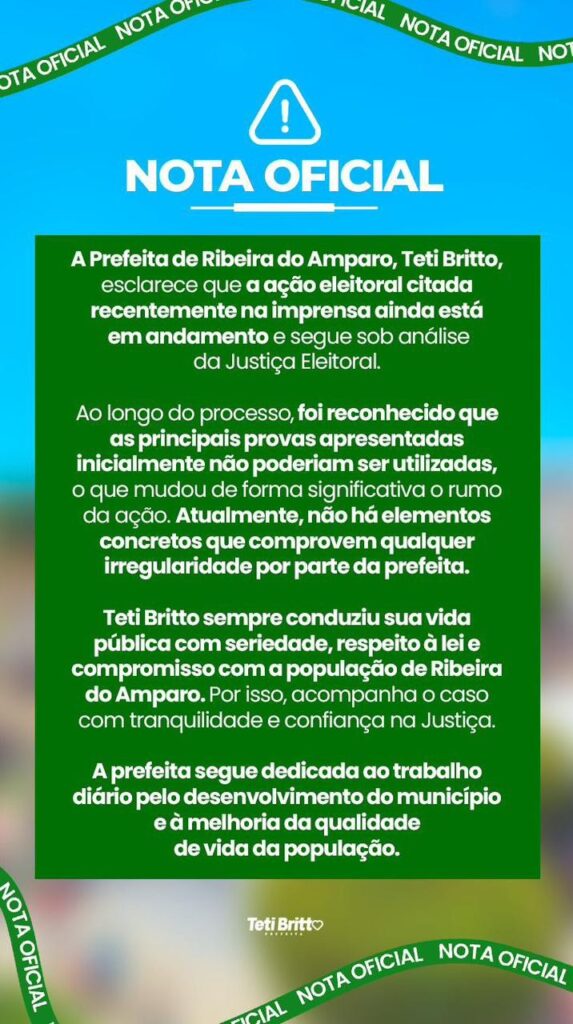 Desta vez através de uma nota aberta a toda a imprensa, Teti voltou a falar sobre a ilegalidade das provas apresentadas, bem como afirmou que “confia na justiça e permanece dedicada ao trabalho pelo desenvolvimento do município de Ribeira do Amparo-BA”. Mas, desta vez a gestora citou que no decorrer do processo, “foi reconhecido que as principais provas apresentadas inicialmente não poderiam ser utilizadas”.