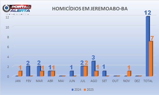 Em 2025, Jeremoabo-BA registrou 07 homicídios, cinco a menos que no ano anterior, uma redução de 42%. Destes, apenas dois (29%) foram cometidos com uso de arma de fogo.