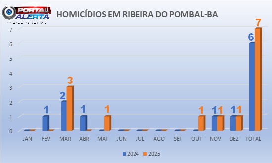 Em 2025, Ribeira do Pombal-BA registrou sete homicídios, um a mais que no ano anterior, um aumento de 16%.