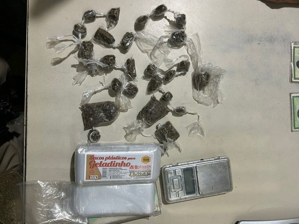 Diante da denúncia, foi feito o levantamento de que em uma das casas morava um indivíduo que estaria guardando entorpecentes para uma facção criminosa. Ao chegar à residência, onde funciona um estabelecimento, foi encontrada apenas a esposa do suspeito, que autorizou as buscas, o que possibilitou no encontro do material ilícito, sendo: 25 trouxas de substância análoga à maconha (aproximadamente 54g), ⁠1 balança de precisão, diversas embalagens de geladinho utilizadas para acondicionar drogas.