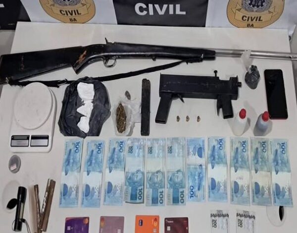 A ação aconteceu na última terça-feira (24), no povoado Raso, após os militares receberem uma denúncia da prática de tráfico de drogas na região. Com a chegada da polícia, o suspeito tentou fugir, porém sem sucesso, tendo em vista que foi alcançado e preso. Com ele foram encontradas armas de fogo, entre elas uma submetralhadora de fabricação artesanal. Também foram apreendidos entorpecentes, uma quantia em dinheiro não divulgada.